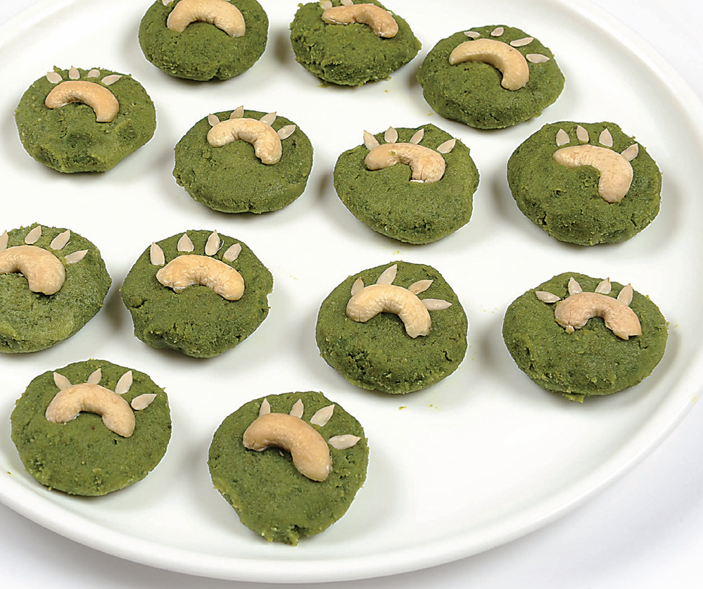 मटर के दानों को आधे प्याले पानी केसाथ पीस कर भारी पेंदे की कड़ाही में डाल कर इतना पकाएं कि मटर सूख जाए। घी, चीनी, इलायची, भांग डाल कर भूनें। ठंडा करें व चिकने हाथों से पेड़ों का आकार दें। काजू व बीजों से सजा कर भांग व मटर के पेड़े