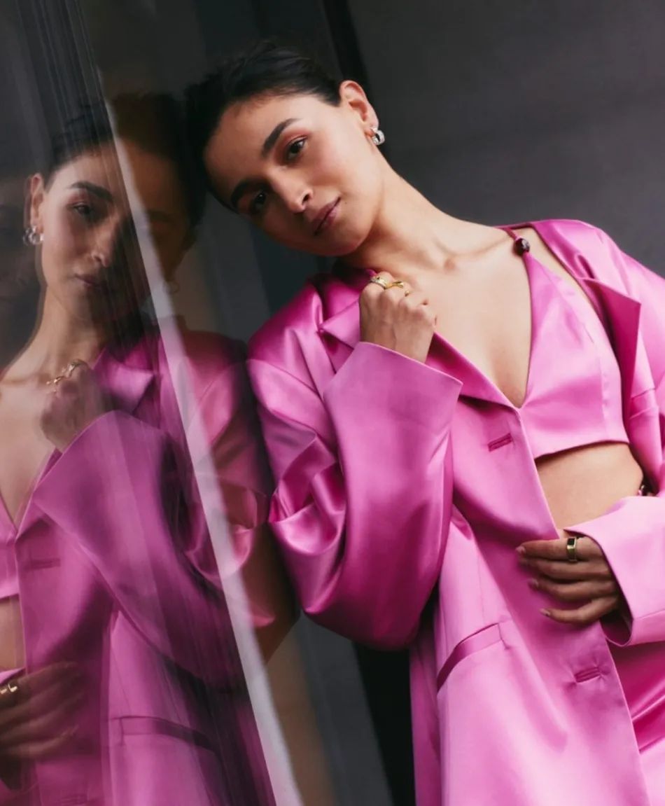 आलिया भट्ट पिंक कलर के सिल्क आउटफिट में नजर आ रही हैं। जिसमें वह बेहद क्यूट लग रही हैं।
