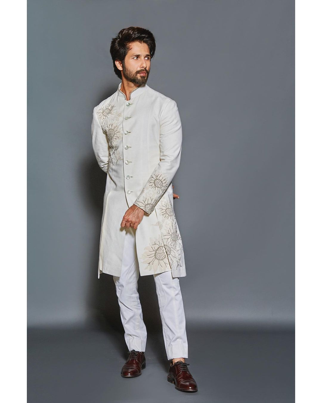 ड्रेप्ड कुर्ता अपने एसिमेट्रिक डिजाइन के लिए काफी ट्रेंड में है। फ्लोरल जैकेट के साथ ये कॉम्बिनेशन आपकों ट्रेंडी के साथ-साथ रॉयल लुक भी देगा।