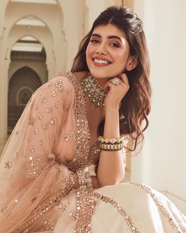 इस लुक में संजना सांघी ने ब्लू कलर का लहंगा पहना है, जिस पर गोल्डन एंब्रायडरी की गई है।