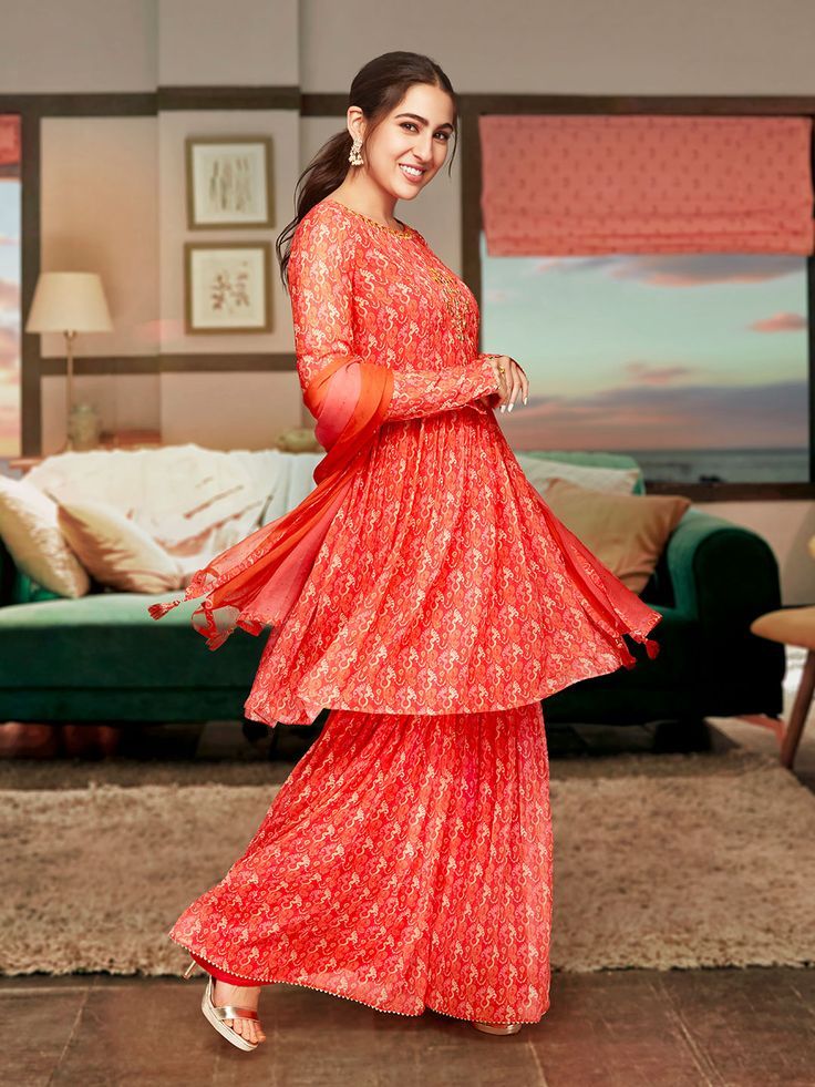 सारा ने फ्लोरल मोटिफ एंब्रॉयडरी वाला शरारा सेट पहना है। खुले बालों के साथ उन्होंने हाथों में हरी चूड़ियां पहनी हुई हैं।