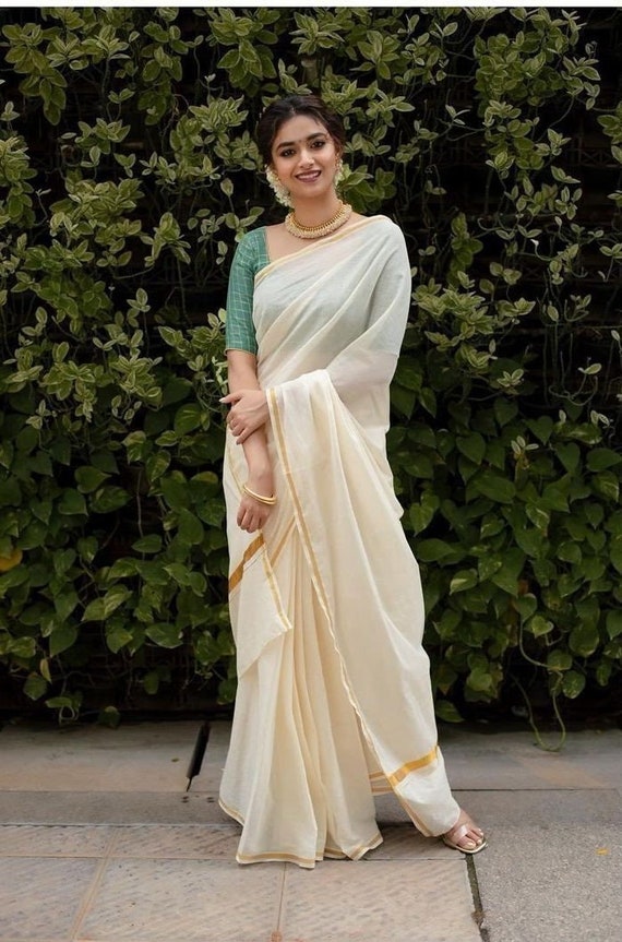 इस फोटो में ब्लैक और गोल्डन बॉर्डर वाले व्हाइट कॉटन साड़ी के साथ रानी मुखर्जी ने मैचिंग डीप नेक ब्लाउज़ पहना है, जिसमें मोटिफ वर्क की डिटेलिंग है।