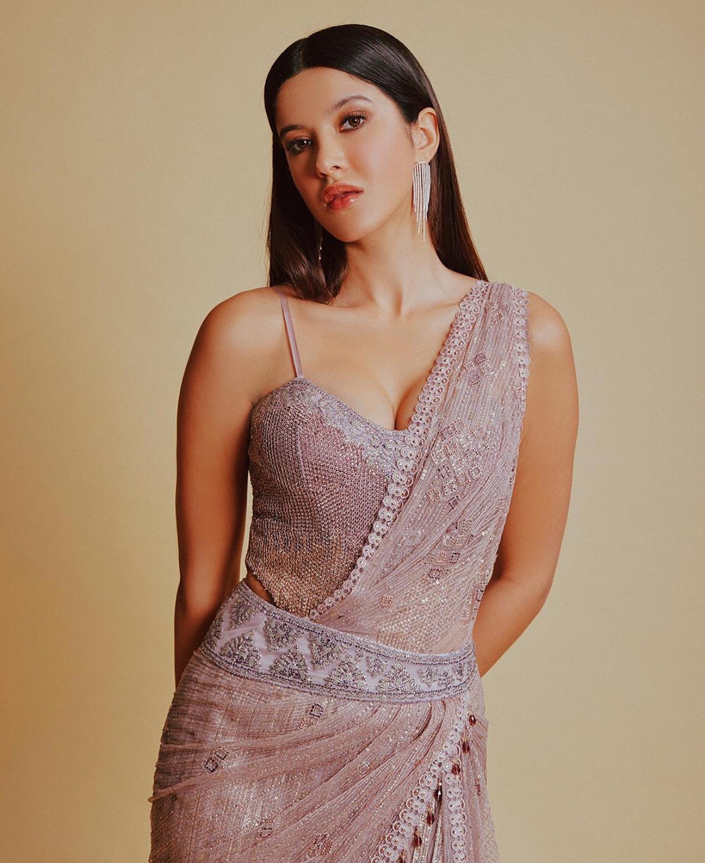 ब्लश पिंक हैंड क्राफटेड सेक्विन साड़ी के साथ शनाया ने मैचिंग ब्लाउज़ पहना है। कोहल रिम्ड आईज़ के साथ उन्होंने बालों को बन लुक दिया है।