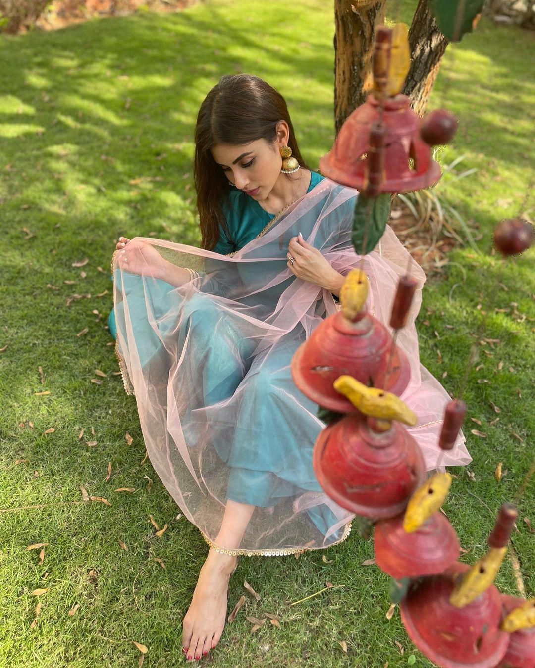 अभिनेत्री ने ग्रीन नेट शिमर साड़ी के साथ ब्रालेट ब्लाउज़ पहना है। लुक कंप्लीट करने के लिए उन्होंने स्मोकी आई मेकअप किया है।