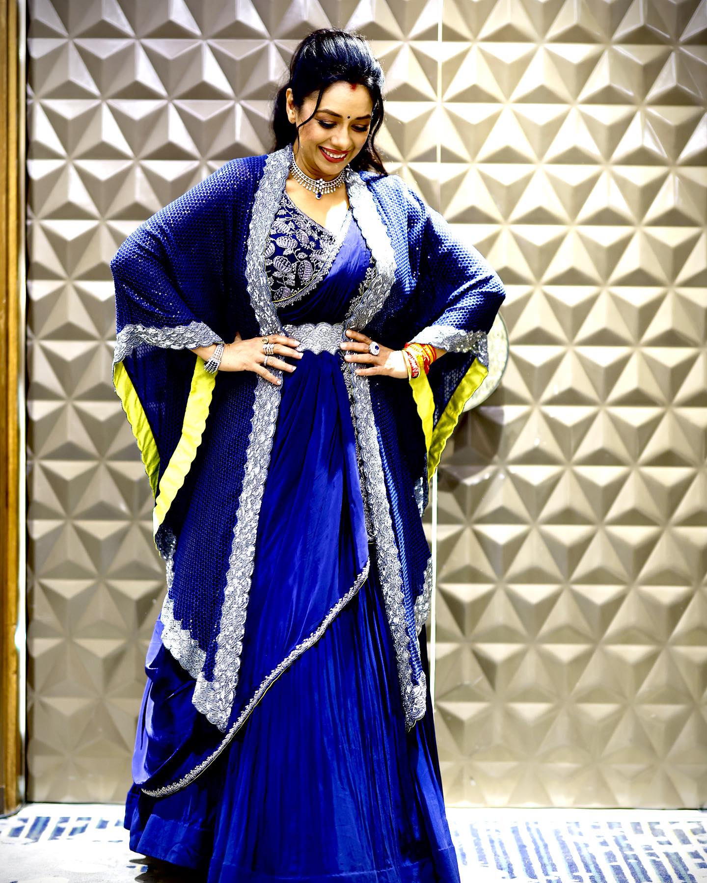 अभिनेत्री ने ब्लू अनारकली सूट पहना है, जिसमें स्टोन वर्क का काम किया हुआ है और हेमलाइन पर सिल्वर गोटा पट्टी भी है।