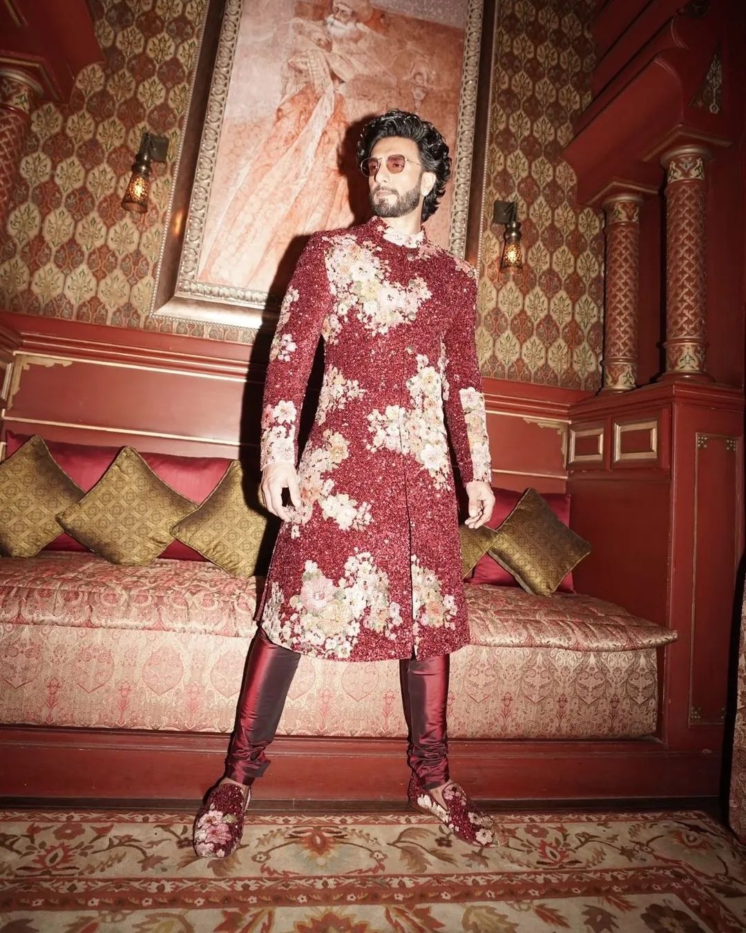 रणवीर सिंह ने रेड कलर की शेरवानी के साथ स्टाइलिश ब्लैक और गोल्डन वर्क वाले शूज कैरी किए हैं और सनग्लास लगाकर लुक पूरा किया है।
