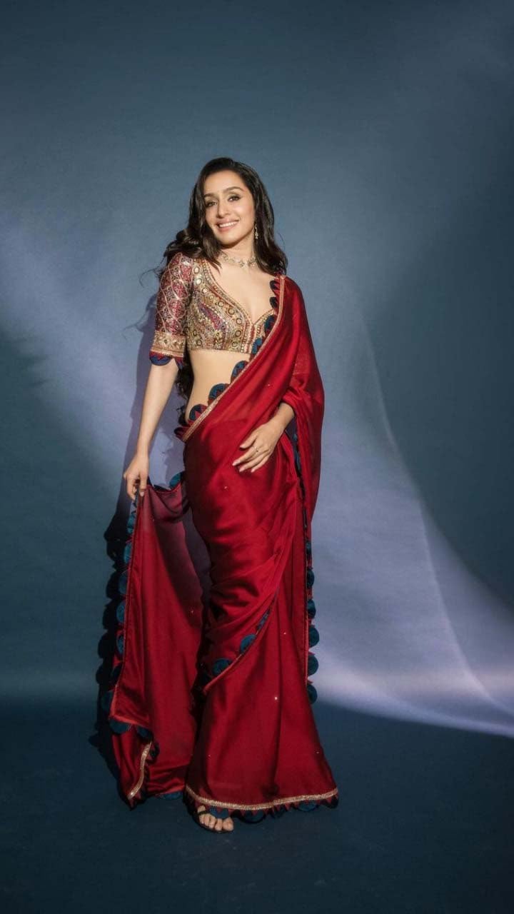 प्रिंटेड रफल साड़ी लुक को श्रद्धा ने ऑक्सीडाइज जूलरी के साथ कैरी किया है। मिनिमल मेकअप और छोटी सी स्माइल लुक को निखार रही हैं।
