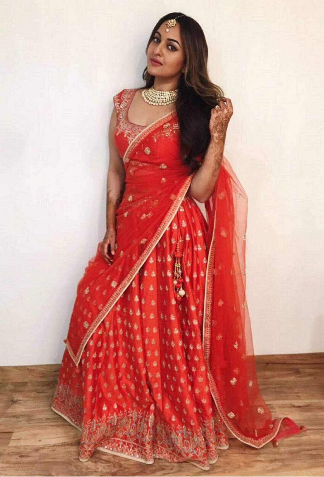 रेड फ्लोरल प्रिंटेड लहंगे और ब्लाउज़ के साथ सोनाक्षी ने कानों में झुमके पहने हुए है। ओपन हेयर स्टाइल और मिनिमल मेकअप से लुक कंप्लीट किया है।