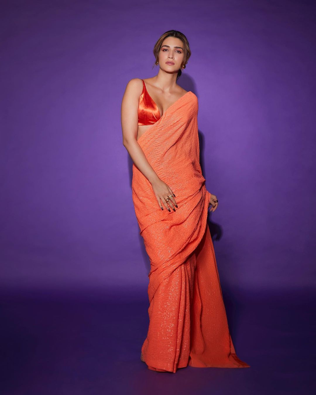 रेड कलर की शियर शिमरी प्री ड्रेप्ड साड़ी को कृति ने मैचिंग स्ट्रेपलेस ब्लाउज़ के साथ कैरी किया है जो देखने में बेहद प्यारा लग रहा है।
