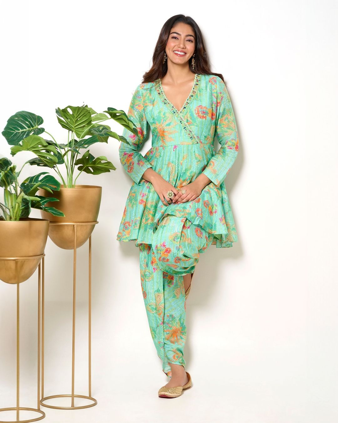पिंक फ्लोरल प्रिंटेड शिफॉन साड़ी के साथ अंकिता लोखंडे ने मैचिंग प्लंजिंग नेक ब्लाउज़ पहना है। ग्लोइंग मेकअप से लुक निखर रहा है।