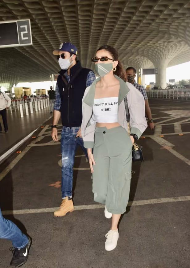 आलिया ने ऑलिव ग्रीन क्रॉप टॉप के साथ मैचिंग ट्राउजर और व्हाइट जैकेट पहना है।