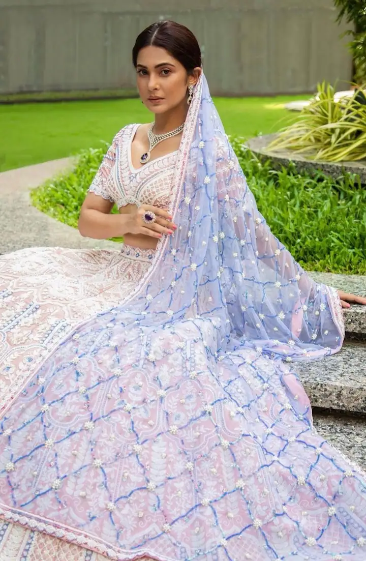 गुलाबी सिल्क लहंगे के साथ अभिनेत्री ने मिरर वर्क फुल स्लीव्स ब्लाउज़ पहना है। उन्होंने ग्रीन इयररिंग्स पहनकर अपने लुक को पूरा किया है।