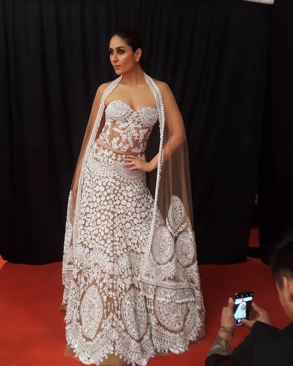 फोटो में गोल्डन शिमर लहंगे के साथ बेबो ने मैचिंग स्वीटहार्ट नेकलाइन ब्लाउज़ और फर डिटेलिंग वाला दुपट्टा कैरी किया है।