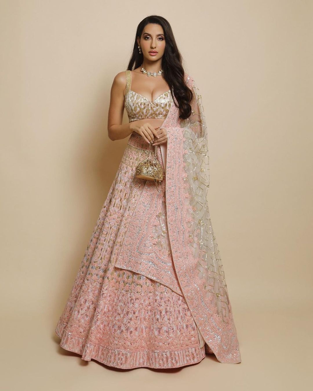 नोरा ने पिंक शिमरी साड़ी के साथ स्ट्रैपी ब्लाउज़ पहना है। न्यूड मेकअप और मैसी हेयर के साथ उन्होंने लुक को पूरा किया है।