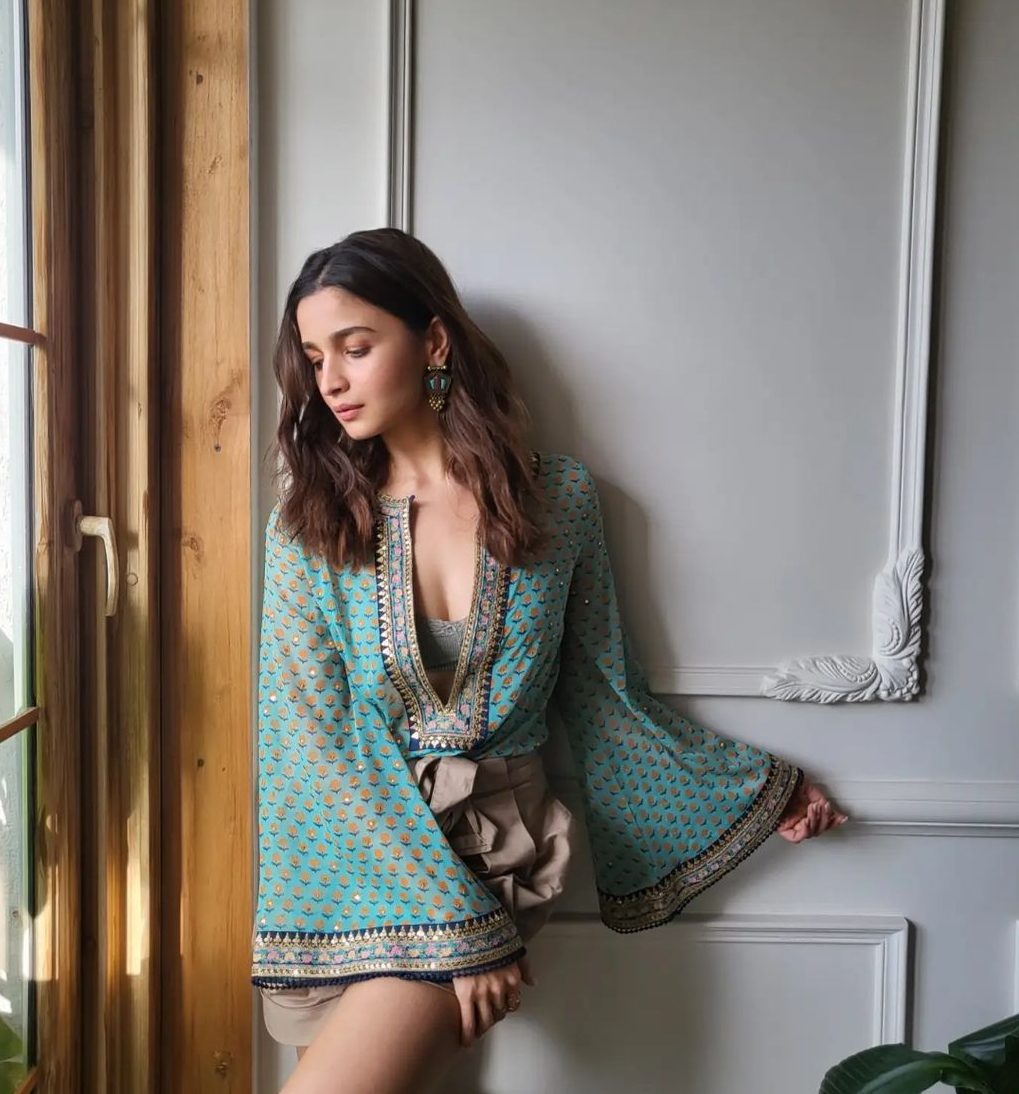 एक्ट्रेस ने पफ़ स्लीव्स शर्ट के साथ बूट कट ट्राउज़र पहना हैं। ओवरऑल नेवी ब्लू कलर ड्रेस में आलिया खूबसूरत लग रही है।