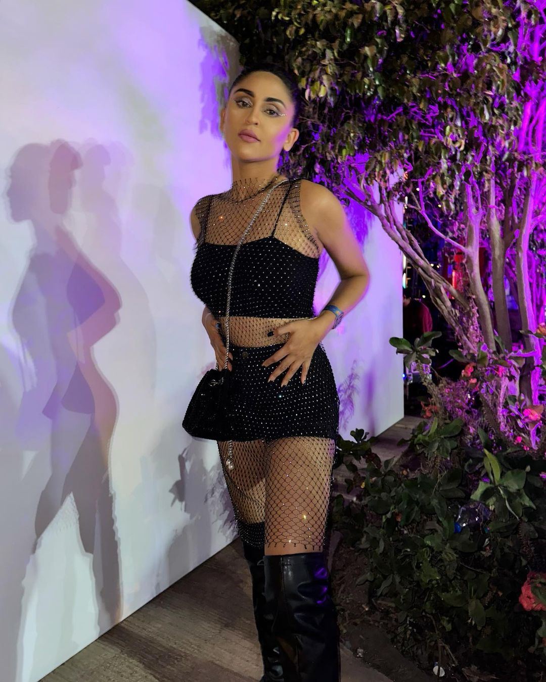 क्रिस्टल ने फ्लोरल प्रिंटेड शरारा के साथ सेक्विन ब्लाउज़ पहना है। उन्होंने लुक न्यूड ग्लॉसी पिंक लिप्स और न्यूड आई मेकअप से कंप्लीट किया है।