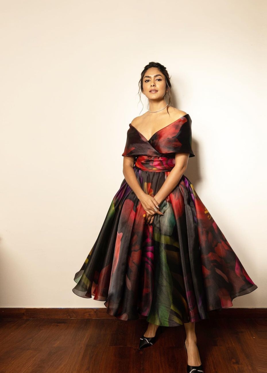 इस लो-कट नेकलाइन की पेस्टल शॉर्ट ड्रेस में मृणाल बेहद स्टाइलिश लग रही हैं ।