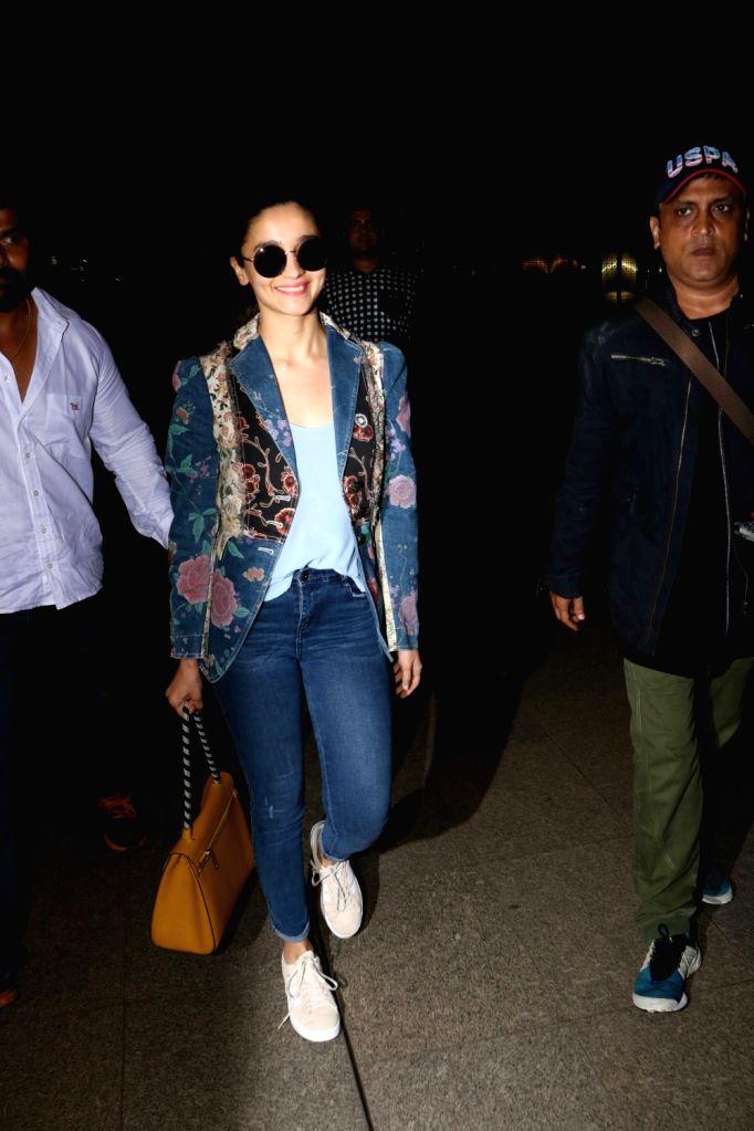 आलिया ने फ्लेयर्ड जीन्स के साथ व्हाइट टॉप और डेनिम ओवर कोट पहना है। मिडिल पार्टिंग ओपन हेयर स्टाइल के साथ उन्होंने लुक कंप्लीट किया है।