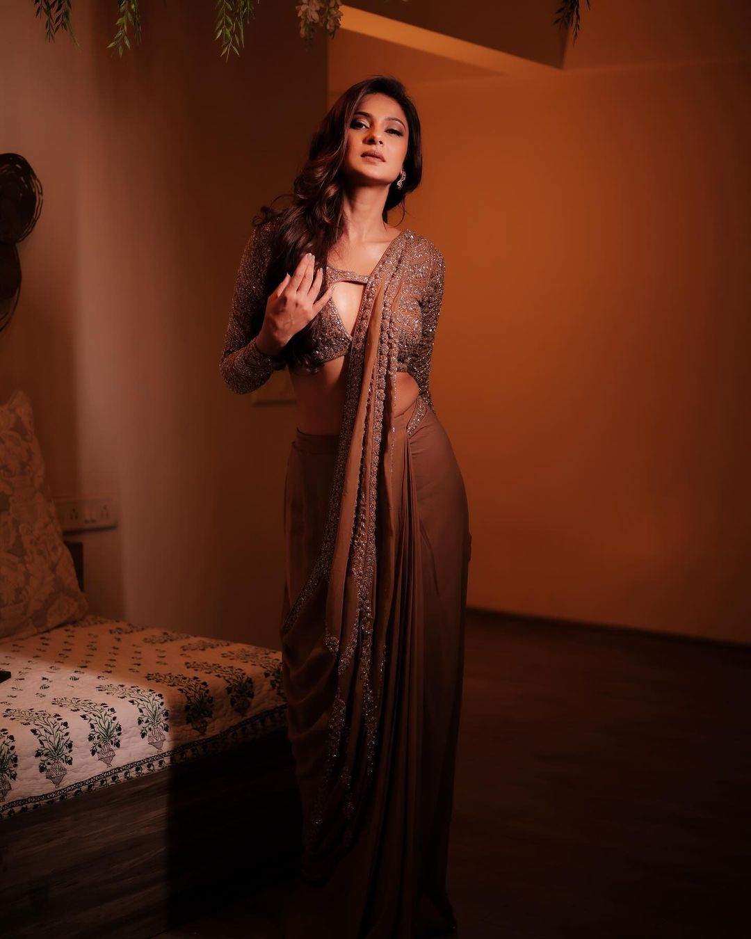 अभिनेत्री ने प्रिंटेड साड़ी के साथ ब्लैक स्लीवलेस ब्लाउज़ पेयर किया है। उन्होंने न्यूड लिपस्टिक से अपने लुक को पूरा किया है।