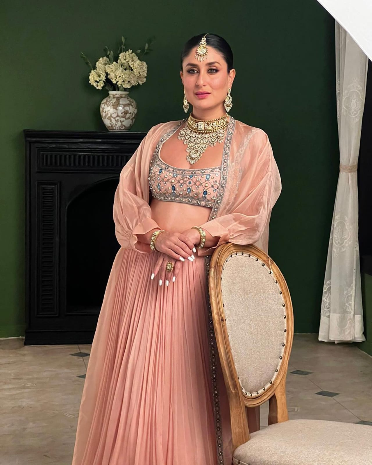 बेबी पिंक अनारकली सूट को बेबो ने मैचिंग दुपट्टे के साथ पहना है। चांदबाली और स्लीक हेयर बन से उन्होंने लुक पूरा किया है।
