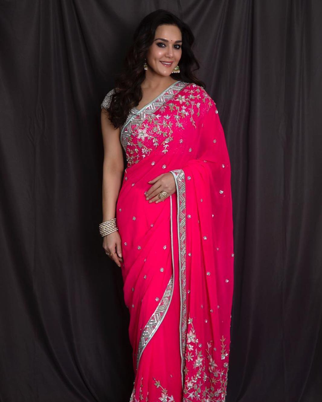 ब्लैक चंदेरी सिल्क साड़ी के साथ प्रीति ने गोल्डन झुमका और कड़ा पेयर किया है। ग्लोइंग मेकअप के साथ उन्होंने माथे पर बिंदी लगाई है।