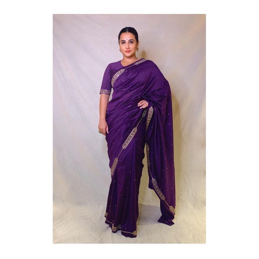 इस फ्लोरल प्रिंटेड साड़ी के साथ विद्या ने गोल्डन शिमर ब्लाउज़ पहना है। स्मोकी आईज़ मेकअप उनकी खूबसूरती बढ़ा रहा है।