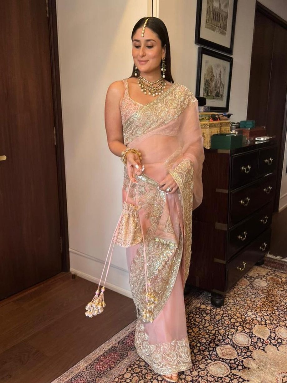पिंक शेड की ऑर्गेज़ा साड़ी को कियारा आडवाणी ने स्लीवलेस ब्लाउज़ के साथ पहना है। कोहल आइज़ से उन्होंने लुक कंप्लीट किया है।