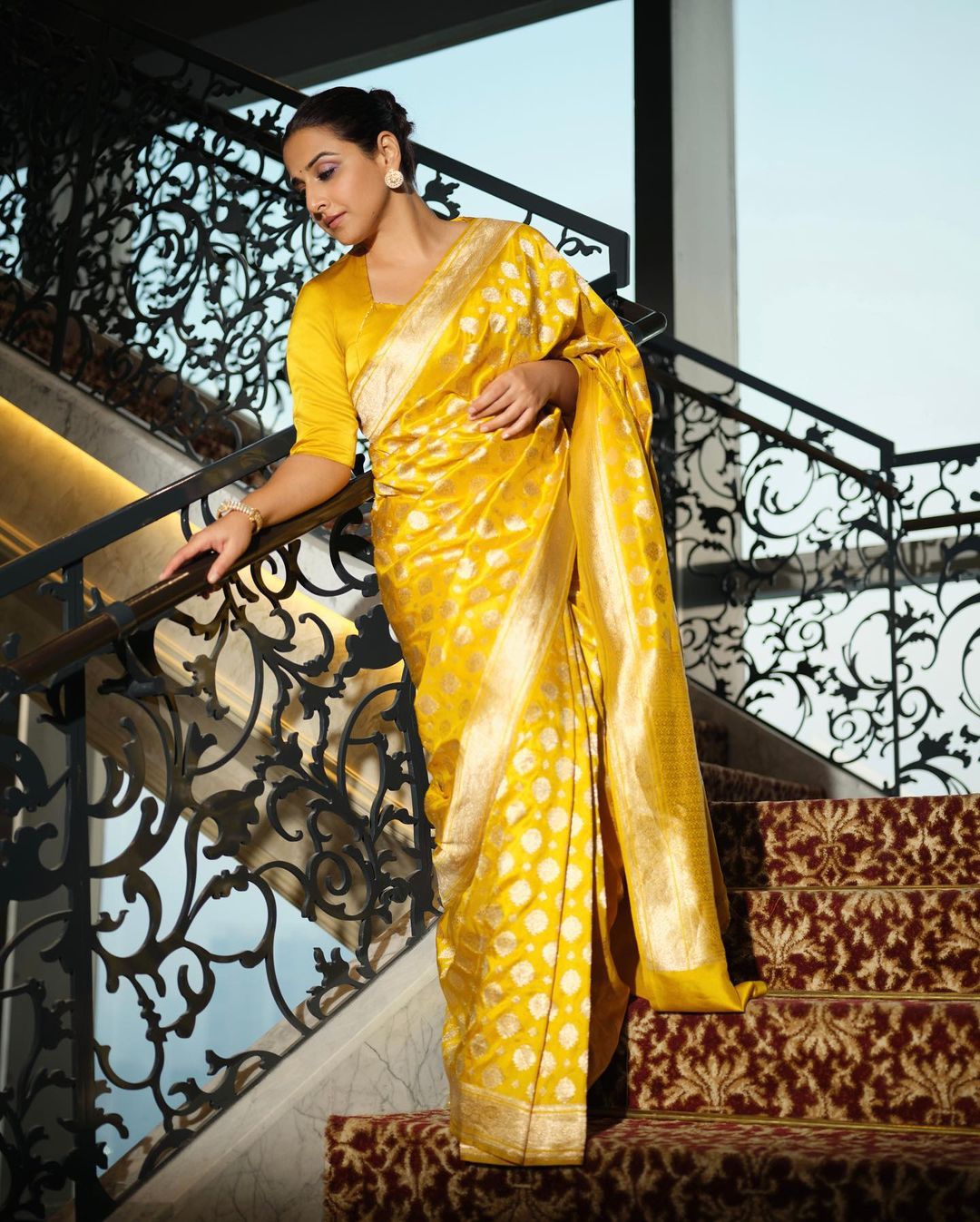 दीया ने लेनिन फैब्रिक वाली येलो साड़ी पहनी हैं, जिसमें जरी के चेक बने हुए हैं, जो उनकी खूबसूरती में चार-चांद लगा रहे हैं।
