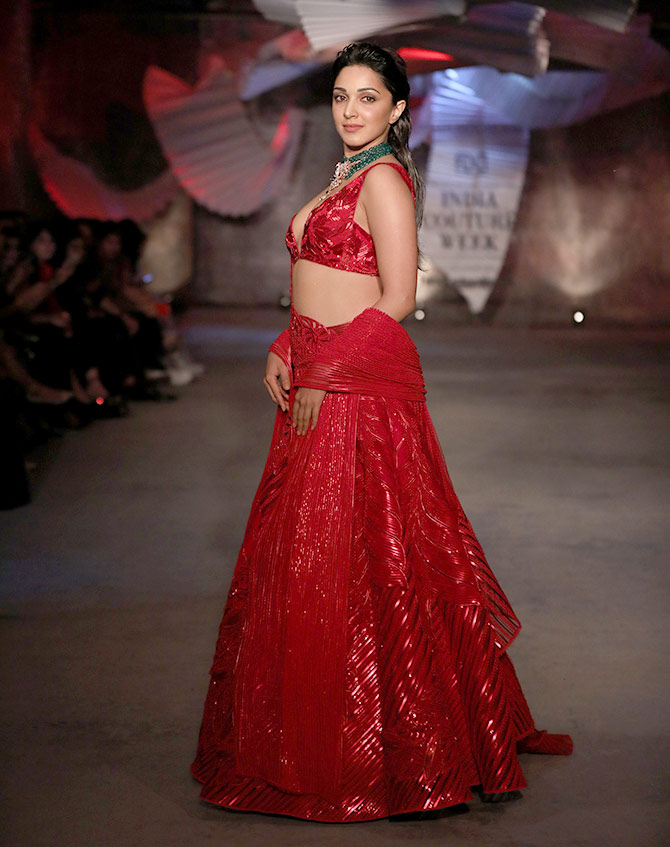 कियारा ने रेड शिमर लहंगे के साथ मैचिंग डीप नेक चोली पहना है। उन्होंने स्टेटमेंट ज्वेलरी और बालों में जुड़ा बनाकर लुक कंप्लीट किया है।