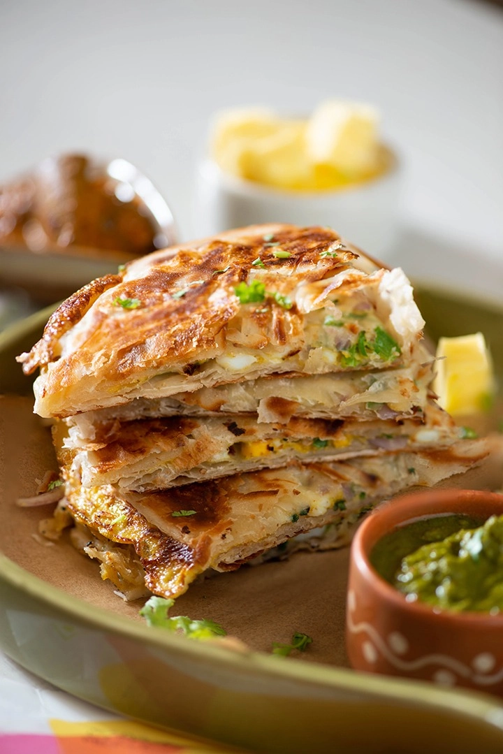 तैयार है आपका मुगलई परांठा। इसे हरी और लाल चटनी के साथ मेहमानों को