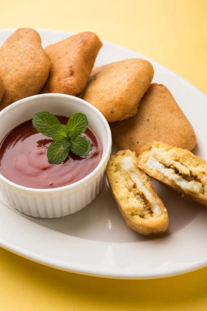 पुदीने की चटनी और केचप के साथ गरमागरमा पनीर के पकौड़े को