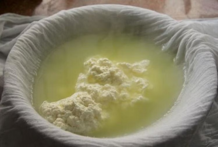 पनीर बनाने के लिए फटे दूध को सूती कपड़े में छानकर इसे पानी निकाल लें। फिर एक भारी चीज से इसे दबाकर रख दें।