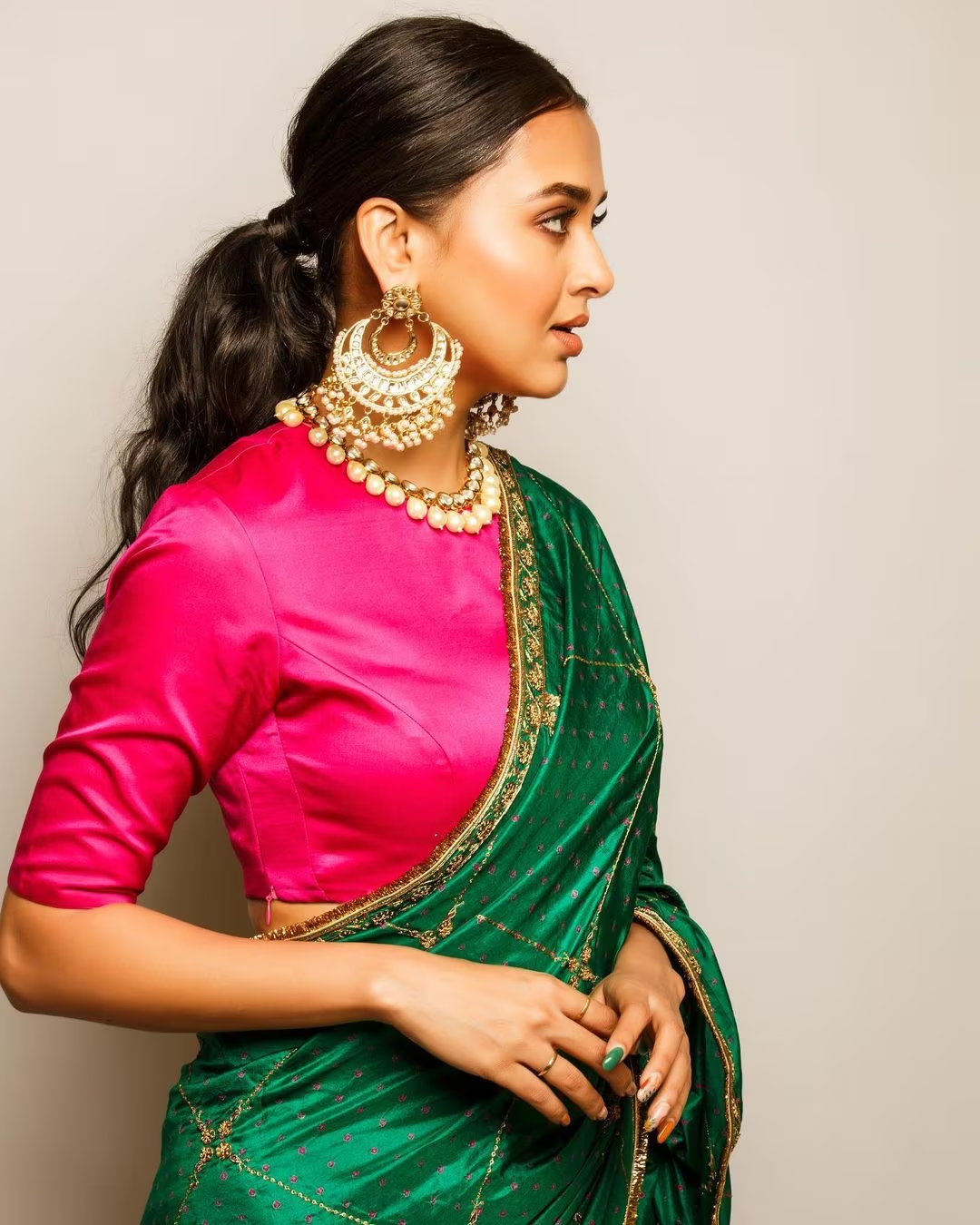 स्लिक मिडिल पार्टेड पोनीटेल साड़ी के साथ भी बेहद स्टाइलिश नजर आती है। यह फेस्टिव सीजन के लिए एकदम परफेक्ट है।