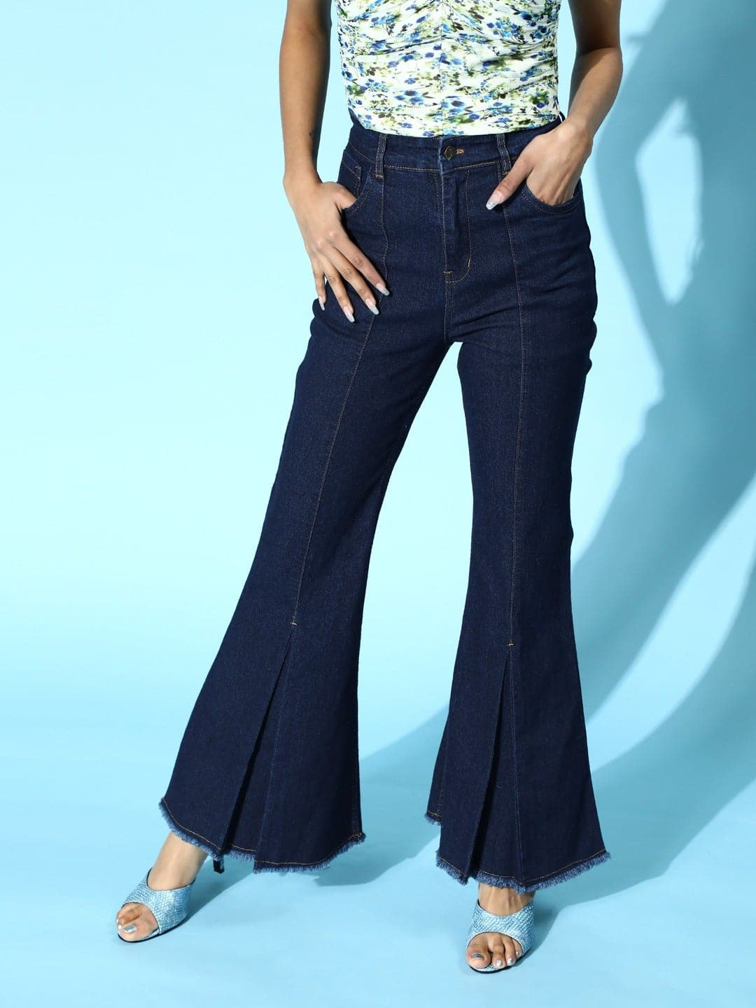 हाई-वेस्टेड फ्लेयर्ड जींस को हील्स या प्लेटफॉर्म के साथ पहनें।
